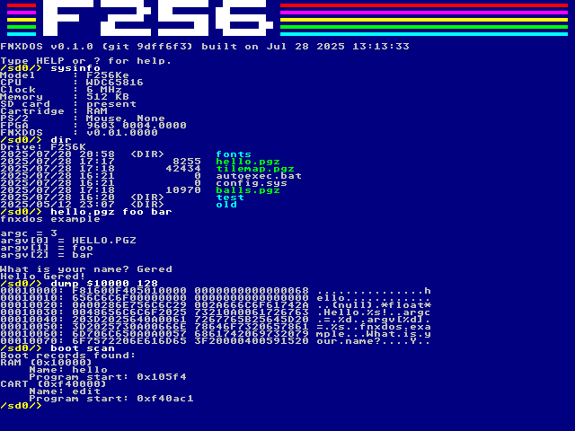This project has come a long way and I'm quite happy with it. It runs on both the F256K (gen1), and the A2560K now as well. However, there is still a lot more to do before I'd call it release-ready. The most important blocker for release is that I don't yet feel like I've stabilized the public APIs that applications developed for FNXDOS would use. These are the functions that would exist in ROM for things like file I/O, basic text screen functionality, and other simple hardware access. It's actually pretty basic stuff overall and is not meant to be fully comprehensive, as these are devices which encourage you to just use the hardware directly. But still, some stable basic API is useful.