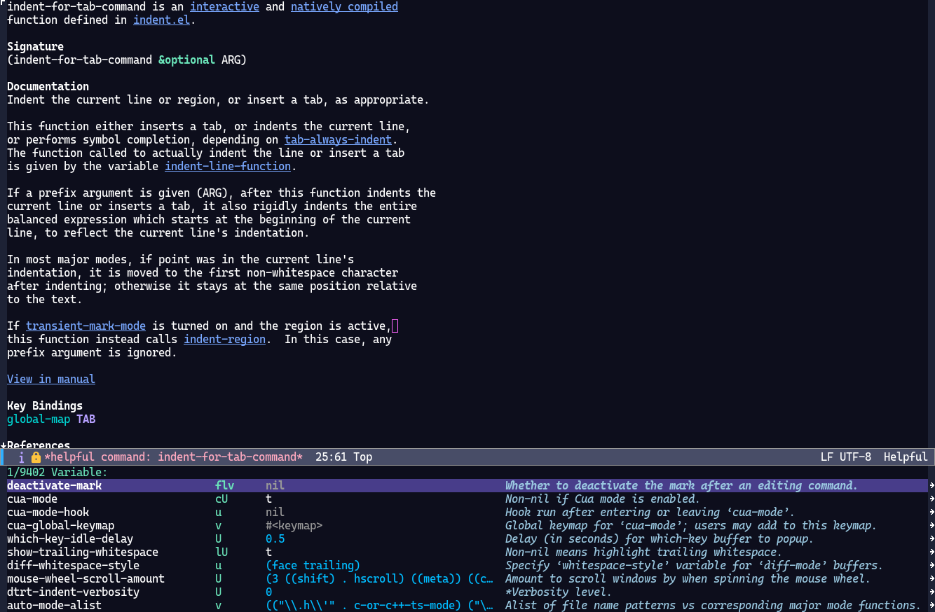 That all being said, I actually do fully intend to keep on using Emacs and learning it more and more. One thing I really love about it is the minibuffer combined with vertico, marginalia and orderless plugins. This really vastly improves the in-editor discoverability of things. If you don't know how to do something but suspect there is probably a command for it, you can easily search through the available commands from M-x. Or search for variables related to settings you're interested in while being able to easily see what their current value is with C-h v. Plus the actual full help pages for all of this stuff are great and can be greatly enhanced by just a couple more plugins if you so desire.